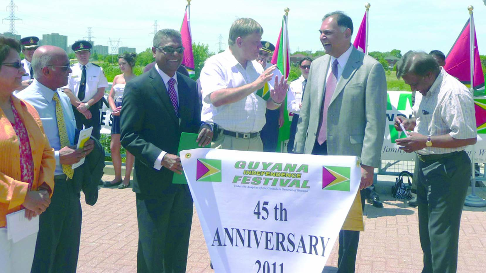 Labour Minister Manzoor Nadir and Guyana’s High Commissioner to Canada, Harry Narine Nawbatt, jointly cut the ceremonial ribbon to declare open Guyana’s 45th Independence Anniversary celebration in Canada over the weekend.