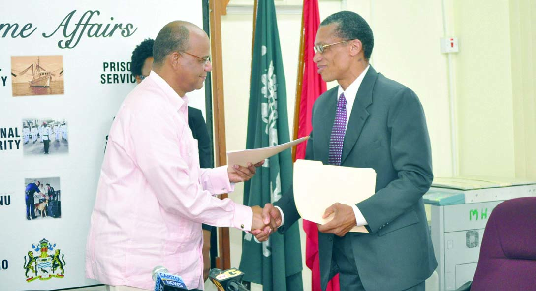 Home Affairs Minister Clement Rohee and OAS Resident Representative Dennis Moses exchange documents after signing the cooperation pact