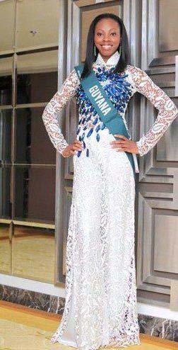 Her evening gown was a yellow, shimmery closely fitted sheath, which was designed by another Guyanese designer, Roger Gary.