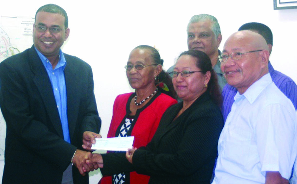 Natural Resources and Environment Minister Robert Persaud hands over the cheque to Amerindian Affairs Minister Pauline Sukhai in the presence of NTC Chairman Yvonne Pearson; GGMC Director Major General (retired) Joe Singh; Permanent Secretary Nigel Dharamlall (partly hidden) and Indigenous Peoples Specialist Ashton Simon