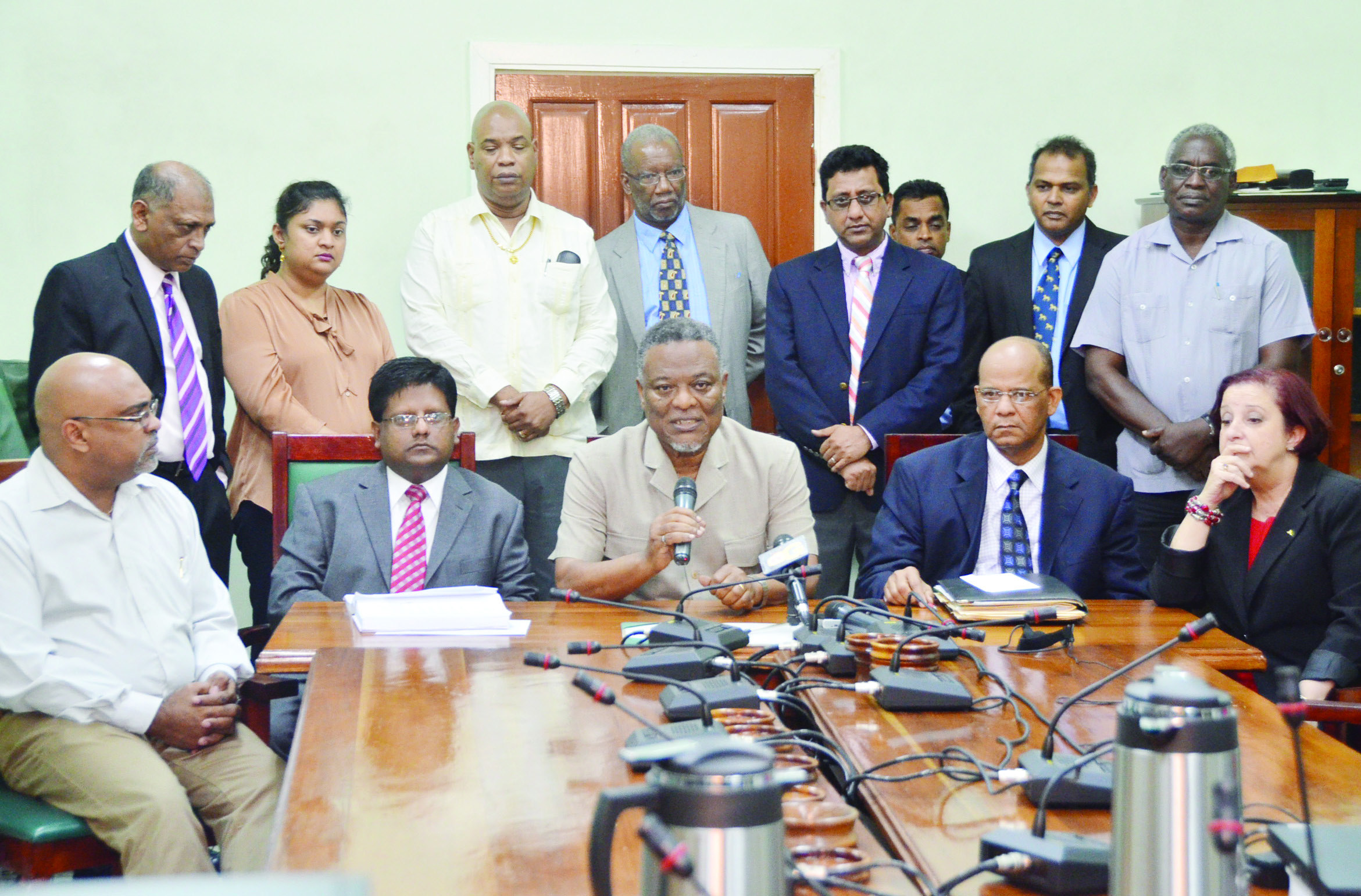 Prime Minister Samuel Hinds and other Government ministers brief the media following the approval of the amended Budget Estimates Wednesday night