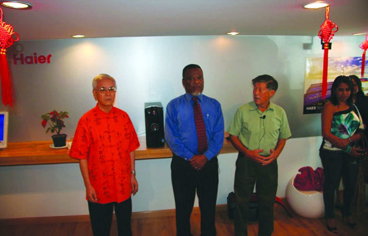 Chinese Ambassador to Guyana Yu Wenzhe, Prime Minister Samuel Hinds and Haier’s local representative Brian James in the Haier Service Centre, Middle Street, Georgetown