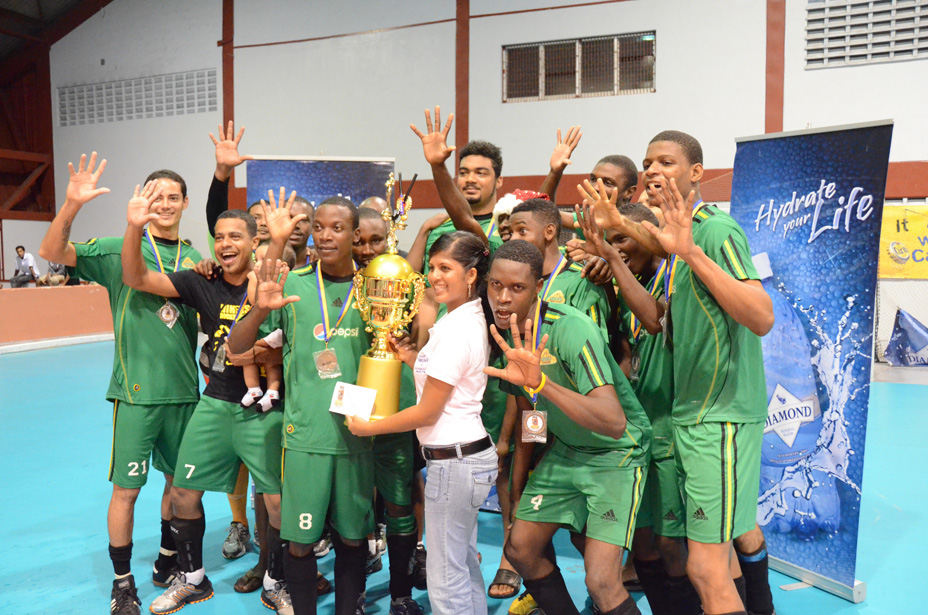 The Hikers men celebrate their fifth win of the Diamond Mineral Water Hockey International Indoor Championships (Treiston Joseph photo)