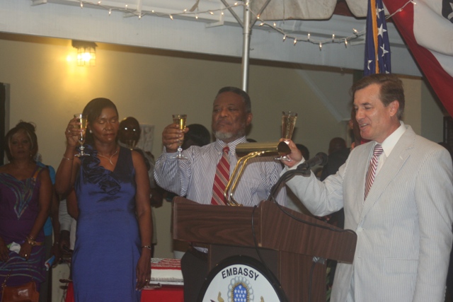 Prime Minister Samuel Hinds performing the functions of President on Wednesday evening attended a reception hosted by the American Ambassador to Guyana, Brent Hardt at his residence to commemorate the United States of America’s 236th anniversary since the signing of the declaration of independence on July 04, 1776. The evening was celebrated under the theme, “American Tapestry.”