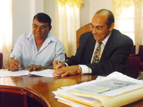 Managing Director of C Deokie and Sons Contracting Services, Chandralall Deokie (left) and President of the Guyana Olympic Association K Juman-Yassin yesterday inked the contract for the construction of phase one of the US$1M Guyana Olympic Association Complex