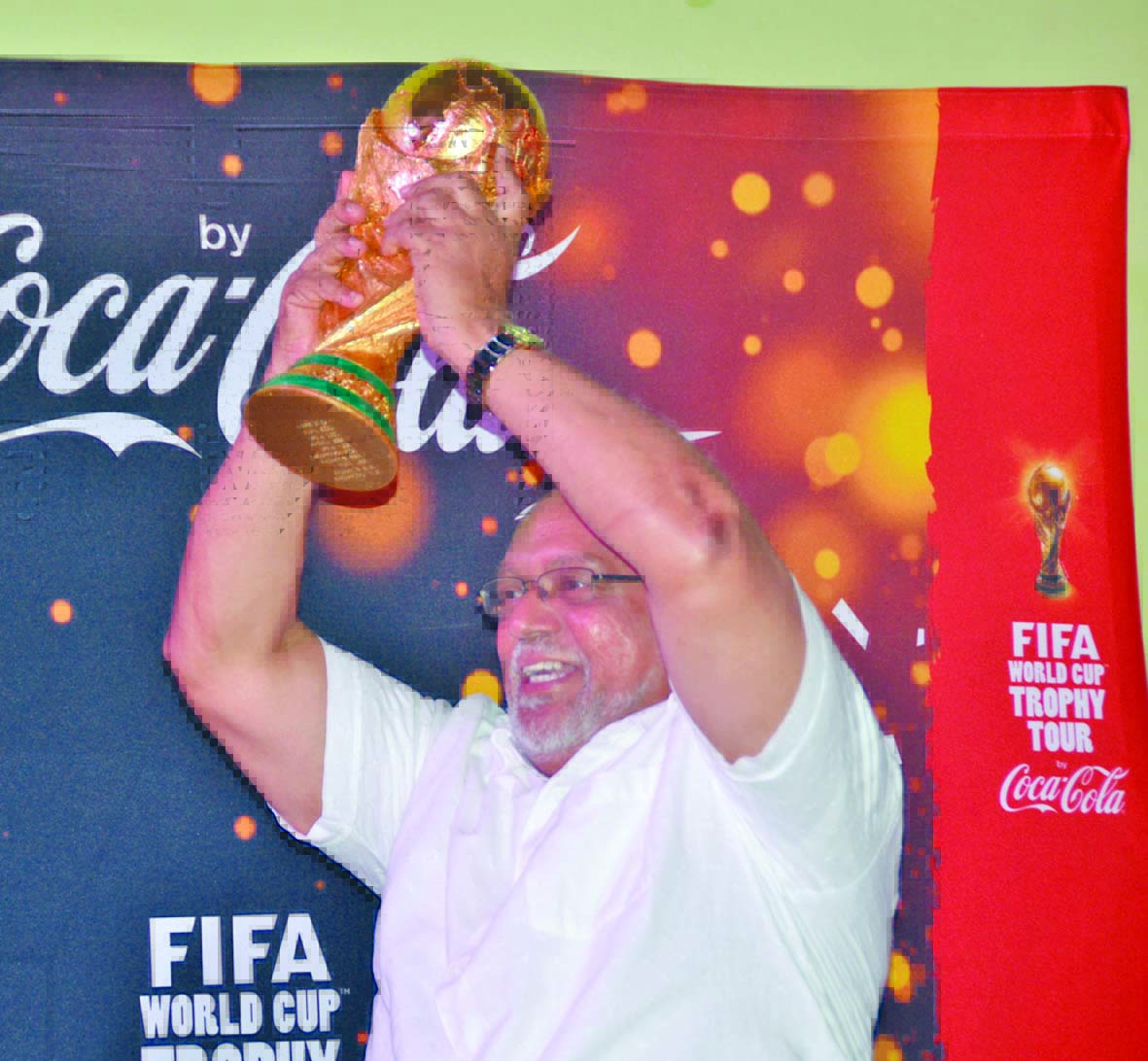 Standing 36 centimetres tall and weighing six kilogrammes, the original 18-carat gold FIFA World Cup trophy arrived in Guyana on Wednesday, creating a frenzy among those privileged to get up close and personal with the iconic sculpture of football.