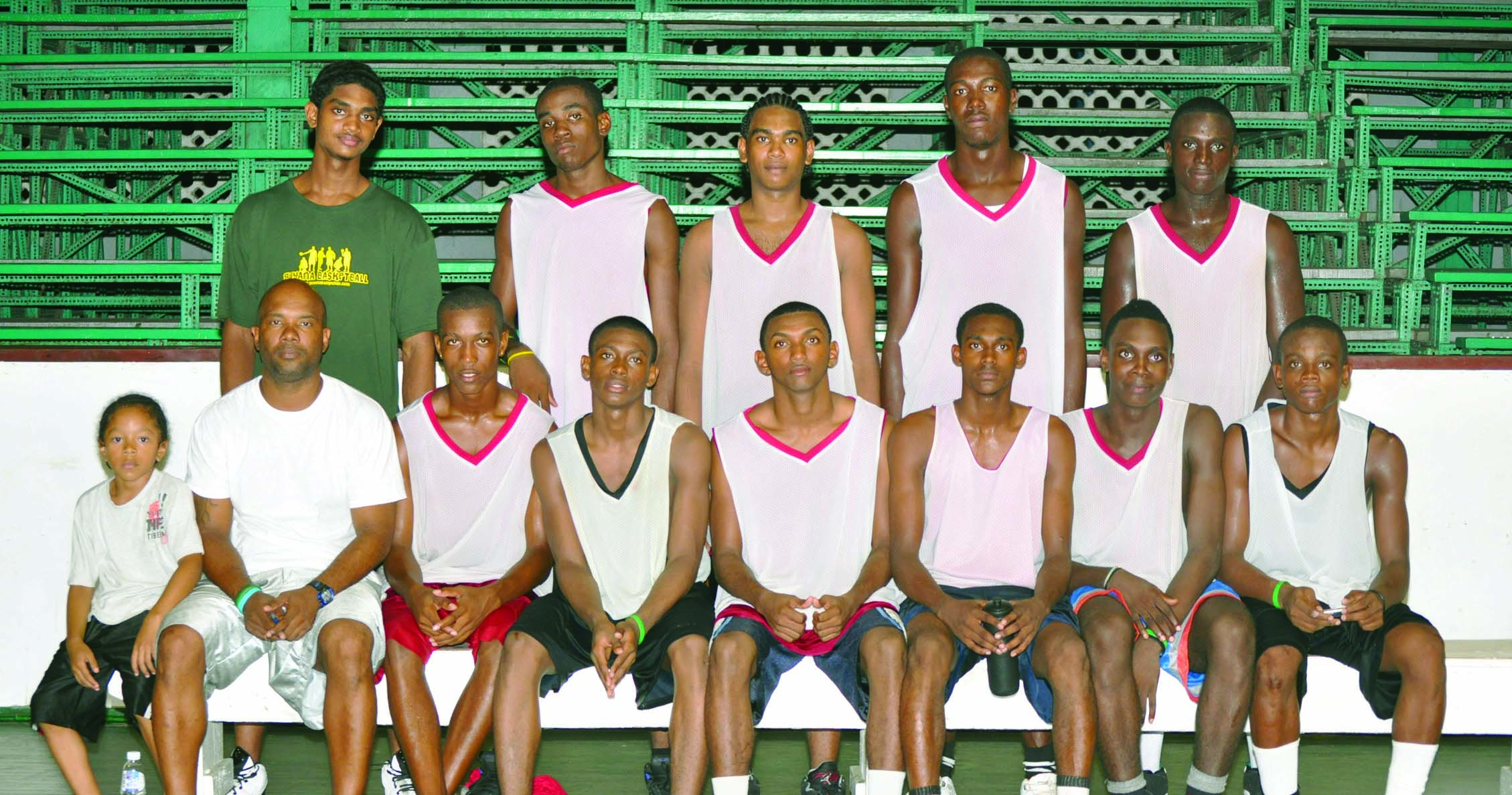 Some members of the IGG male basketball team and coach Lugard Mohan (seated left) after one of their practice games last weekend at the Cliff Anderson Sports Hall in Georgetown