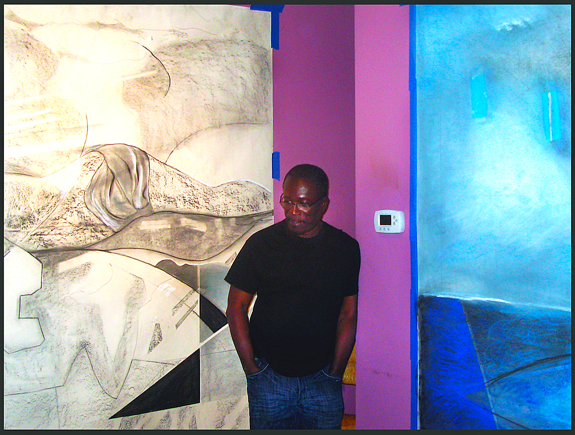 As his inspiration, he draws upon a spectrum of cultural influences from his native Guyana, the Caribbean, South and North America. Armed with these images, myths, and folkloric figures, he then evokes a magical landscape leading the viewer into a world wherein he meets the ancestors. Because of the premise on which his work is being made, the appearances of the images on a textured surface often force the viewer to complete the images in their own mind.