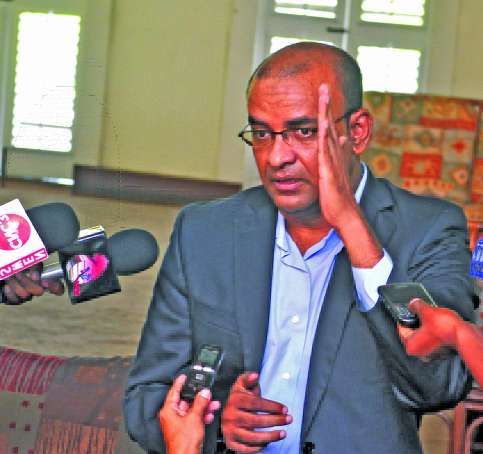 President Bharrat Jagdeo gesticulates during a media briefing at State House on July 31