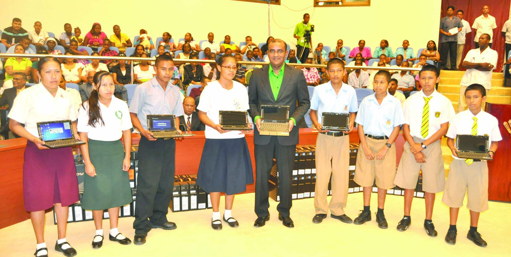 Hinterland scholarship students receive laptops from President Jagdeo at the launch of the One Laptop Per Family programme