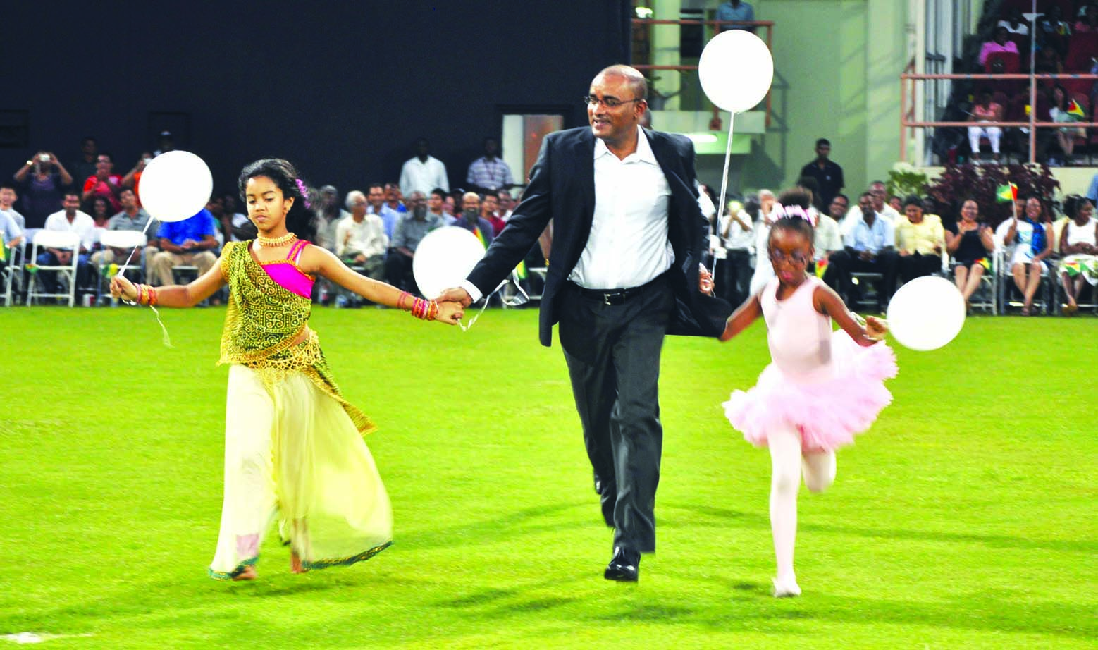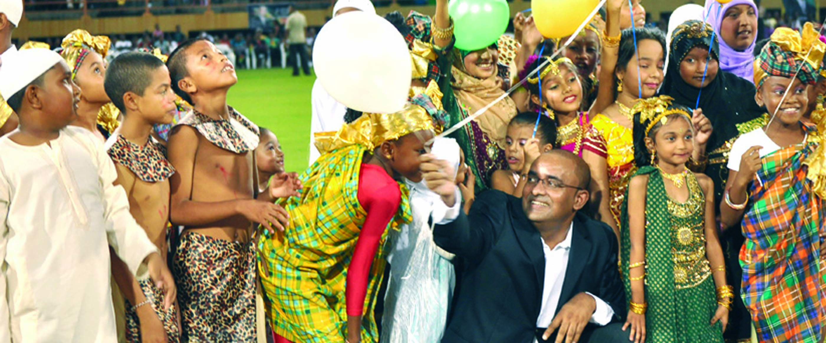 Former President Jagdeo being led by children to the field to take part in the cultural presentation in his honour at the Guyana National Stadium at Providence