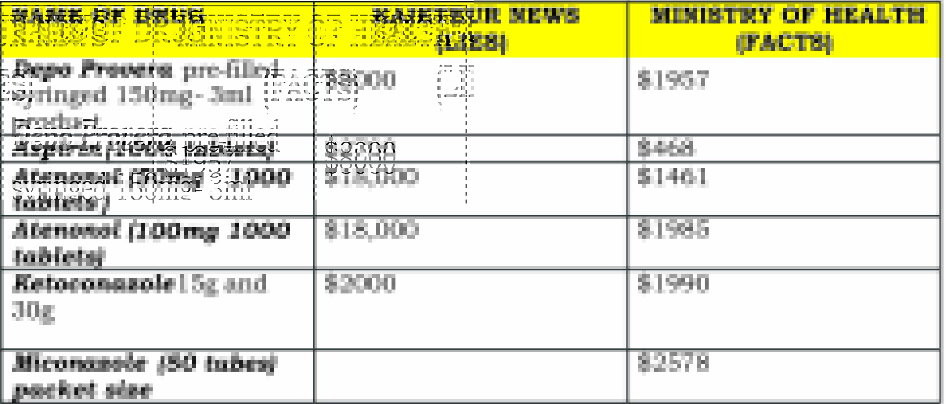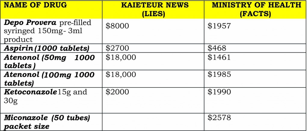 Dr Ramsaran addressed what he called “the mischief of the myth of the pathological, spurious counterfeit claims of these inflated prices Gy$8000 versus a few hundred dollars” made by the Kaieteur News. Depo Provera, a contraceptive injection for females, was purchased for Gy$1561 in 2011 and not Gy$8000. This price for this pre-syringed 150mg to 3ml product has had a slight increase in 2012 to Gy$1957. The discredited Kaieteur News claimed that the Health Ministry had bought the injection for as much as Gy$8 000 from the NEW GPC.