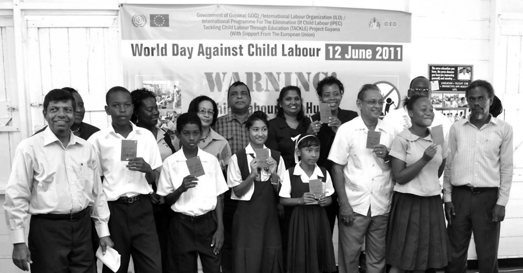 Minister Baksh poses with education and labour officials and students holding up the red card against child labour
