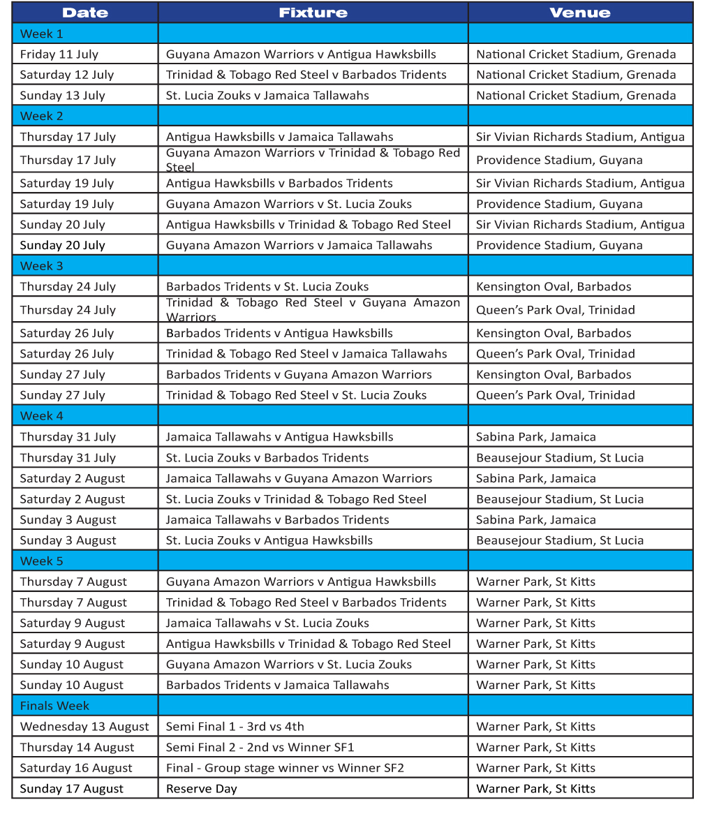 Damien O’Donohoe, CEO of the Limacol Caribbean Premier League, said: “It’s a thrill to be able to announce the full schedule for this year’s tournament. Each island will deliver a party like no other, and the combination of world-class internationals and exciting Caribbean talent will thrill the crowds, ensuring that this year’s Limacol Caribbean Premier League will be like no other cricket tournament, combining unbelievable, dramatic action on the field and a unique, vibrant carnival atmosphere off it.”