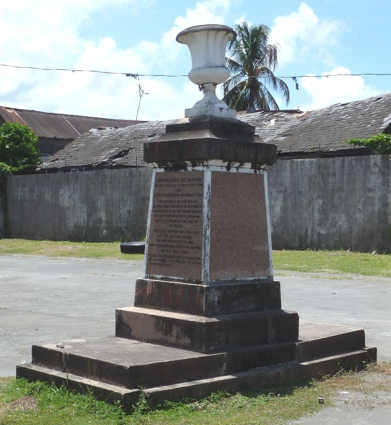 A monument called The Saffon Monument was erected on his grave site in the church’s compound. Described as a granite monument, it reads in part, ‘Pierre Louis de Saffon: Born in France in the year 1724, and Died in Demerara in August 1784: The Revenue of his Estate, after other bequests, be bestowed in perpetuity, on the maintenance of ten poor destitute orphans, until attaining the age of 16 years.’