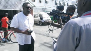 Clive Lloyd being interviewed by media operatives outside the Ministry of Culture, Youth and Sport Wednesday