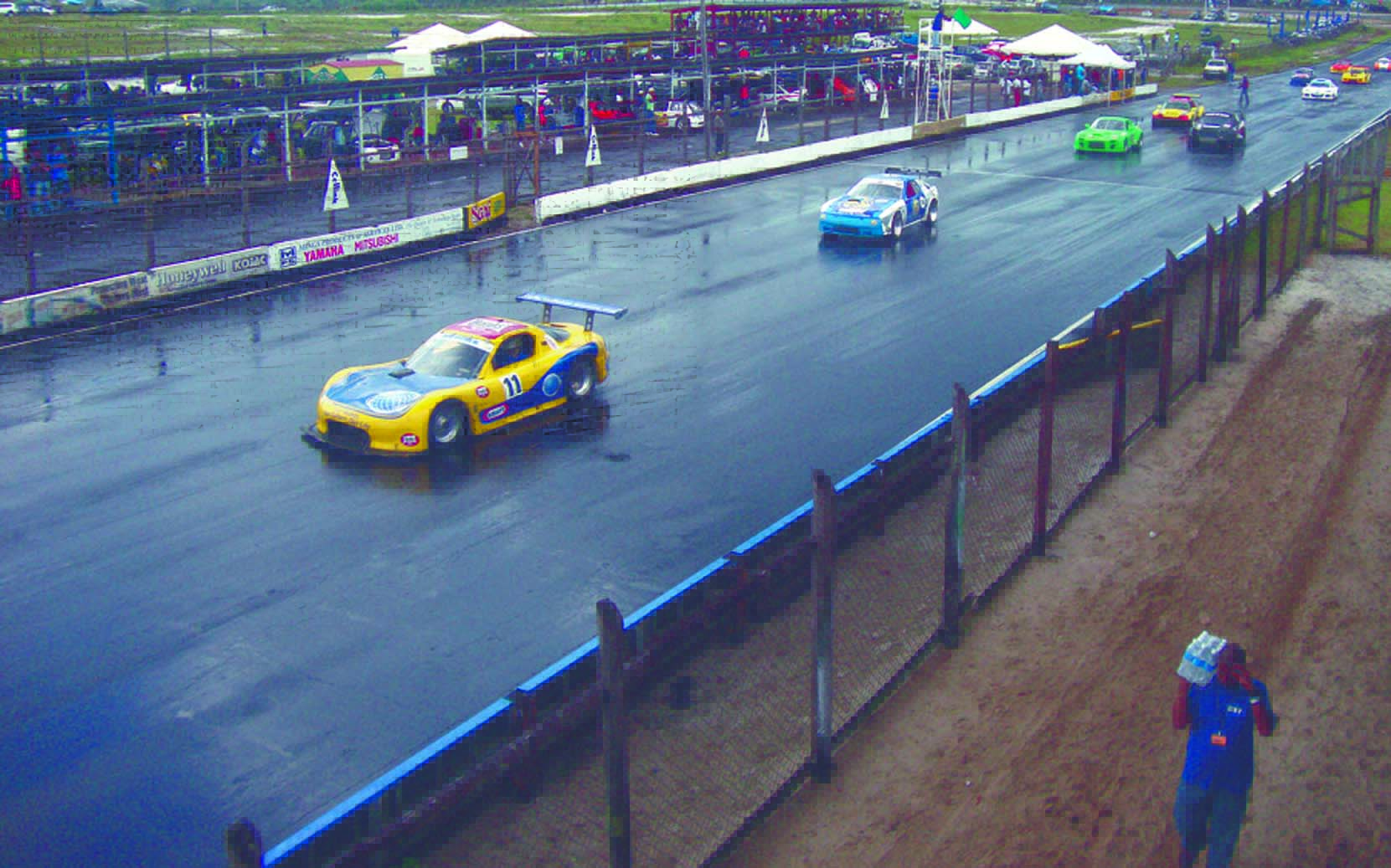 The rain continued to bedevil even the elite Group Four drivers. Attempting to make the first turn right after the green flag, two drivers failed in this undertaking. One of them was Mark Vieira.
