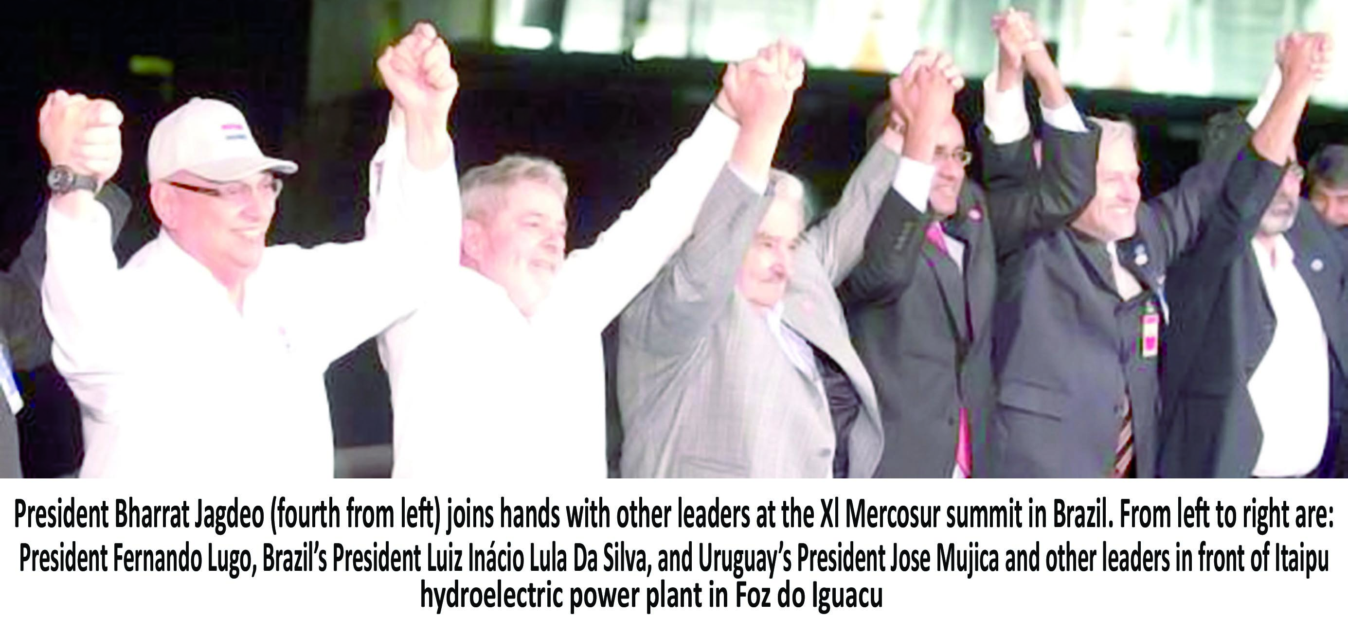 President Bharrat Jagdeo on Thursday participated in the closing of the social forum of the XL Mercosur summit in Foz do Iguacu, Brazil, and subsequently attended a state dinner hosted by Brazilian President Luis Inácio Lula da Silva. The Guyanese leader will participate in the plenary session today. The South American trade bloc launched a plan on Thursday, December 16th, to adopt common trade, investment and immigration policies to help underpin unprecedented economic growth in the region, Reuters reported.