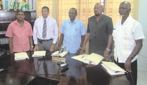 Local Government and Regional Development Minister Ganga Persaud with Minister within the ministry Norman Whittaker, Permanent Secretary Collin Croal, Chief Regional Development Officer Sewchan, and Advisor to both ministers, Clinton Collymore at the ministry’s Kingston office
