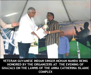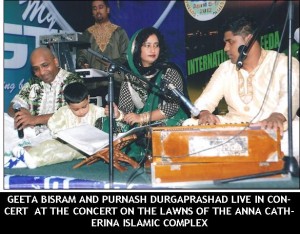 International Recording artiste, Guyanese born, Geeta Bisram, Sa Re Ga Ma Pa’s contestant and member of the famed Suresh Wadkar Ajvasan Academy of Music, Purnash Durgaprashad, along with Leader of the Angels Caribbean Entertainment Group out of New York, USA, Vinod Bisram, and other members of the Group thrilled the audience in a historic single concert “Shyaam-e-Mehfil (An Evening of Ghazals)” on the lawns of the Anna Catherina Islamic Complex on April 7 last. The Program was part of the activities for Guyana’s hosting of the 10th International Qaseeda Competition and was hosted by The Muslim Youth League of Guyana and the Guyana Telephone & Telegraph Company.