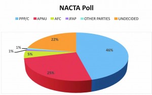 According to NACTA, the PPP/C enjoys 46 per cent of popular support, ahead of the newly- formed A Partnership for National Unity (APNU) with 25 per cent, the Alliance For Change (AFC) with five per cent, the Justice For All Party (JFAP) with one per cent, and the other minor parties with one per cent.