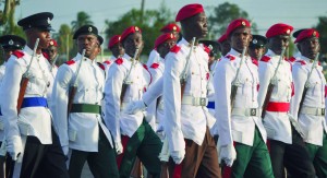 Newly-commissioned officers of the Guyana Defence Force Standard Officers Course # 43 and Reserve Officers Course # 15 march along the GDF’s drill square on Thursday during the commissioning ceremony