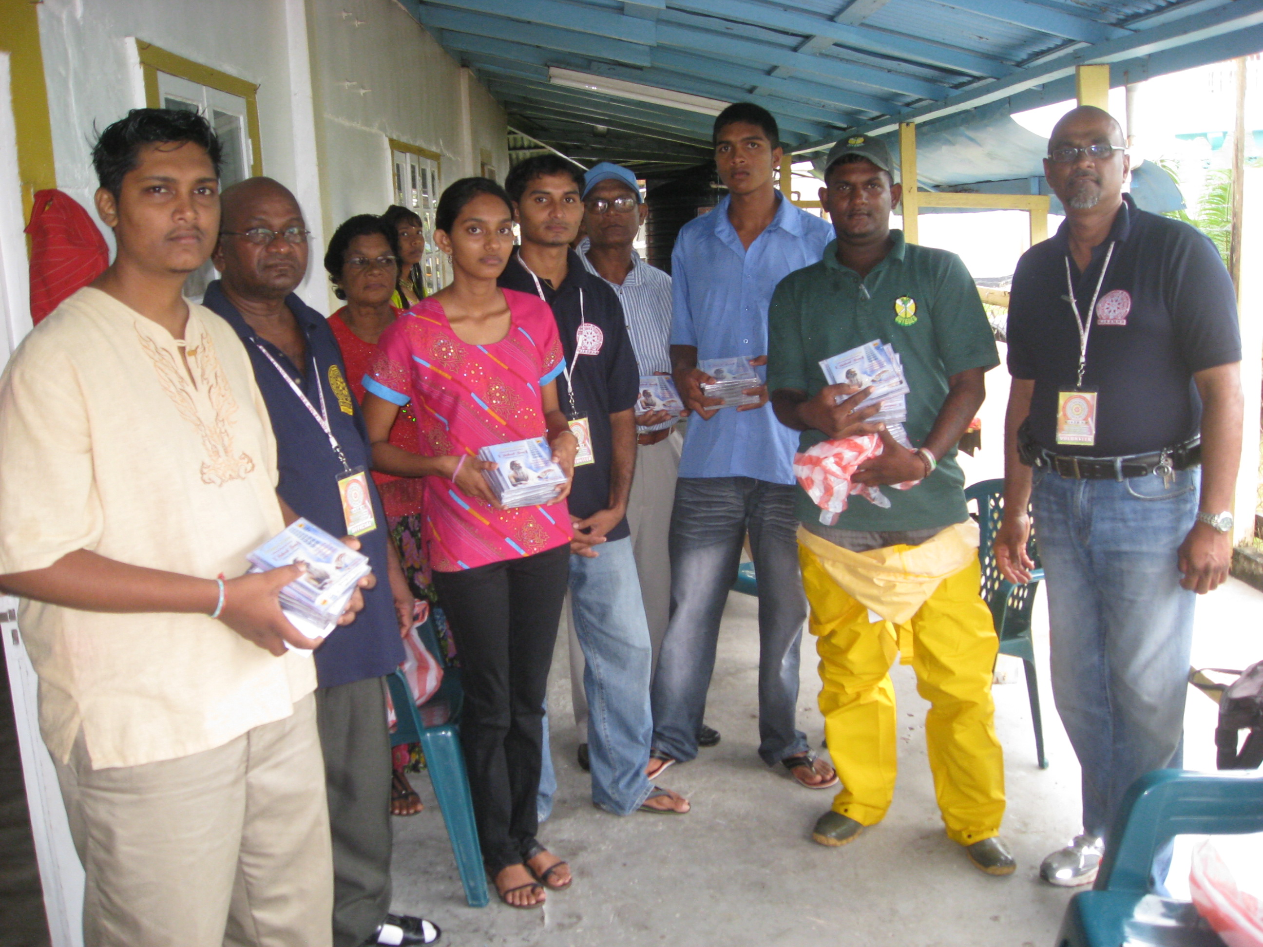 Pandit Suresh Sugrim (extreme right) and members of the Guyana chapter with some recipients of the CDs