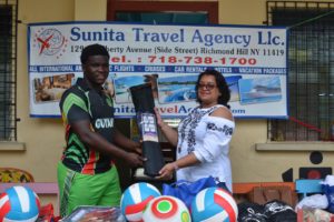 The popular travel agency of Richmond Hill, Queens and beyond, serving the community for more than ten years, also donated a bat to a member of the Guyana Under-19 team Joshua Jones. Jones a resident of the area expressed thanks to the agency and said this will definitely help him as he is interested in developing as a player with all-round potential.