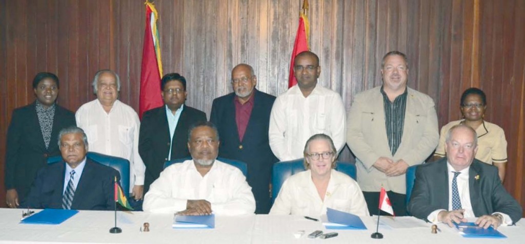 Prime Minister Samuel Hinds and Chief Executive Officer of Guyana Goldfields Incorporated Patrick Sheridan accompanied by President Bharrat Jagdeo, Donald Ramotar, Sir Shridath Ramphal, Finance Minister Ashni Singh, Major General (rtd) Joe Singh and other top officials of the GGMC and the gold firm pose for a photograph following the signing of the mineral agreement on November 18 at the Office of the President