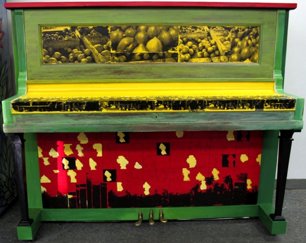 The painter worked on 2 pianos: Guyana and Suriname. The Guyana piano was placed in Mel Lastman Square, New York, and the Suriname piano in Sick Kids Hospital. For the Guyana piano, the images gel- transferred to the surface of the piano refer to the streets, people, food and landscape of Guyana. The map of the country is repeated on the area behind the pedals and a painting of the flower ‘Bird of Paradise’ is located on the left side.