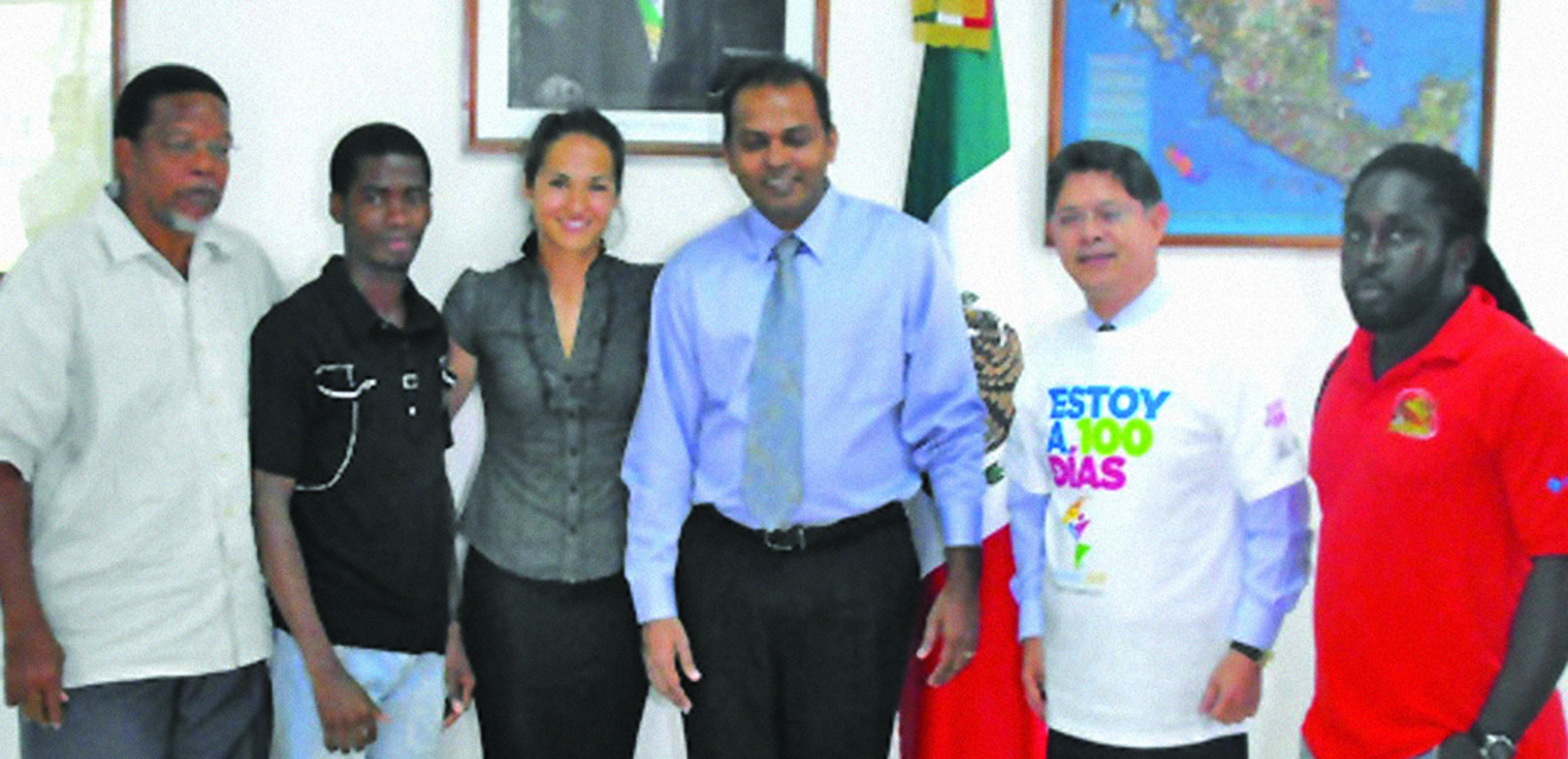 Flashback: Head of Delegation Noel Adonis (left) posses with Cleveland Forde and other athletes and delegates when the Mexican Embassy held a function to celebrate the countdown of 100 days to the PanAm Games earlier this year. Forde has recently indicated that he will not be competing in the event