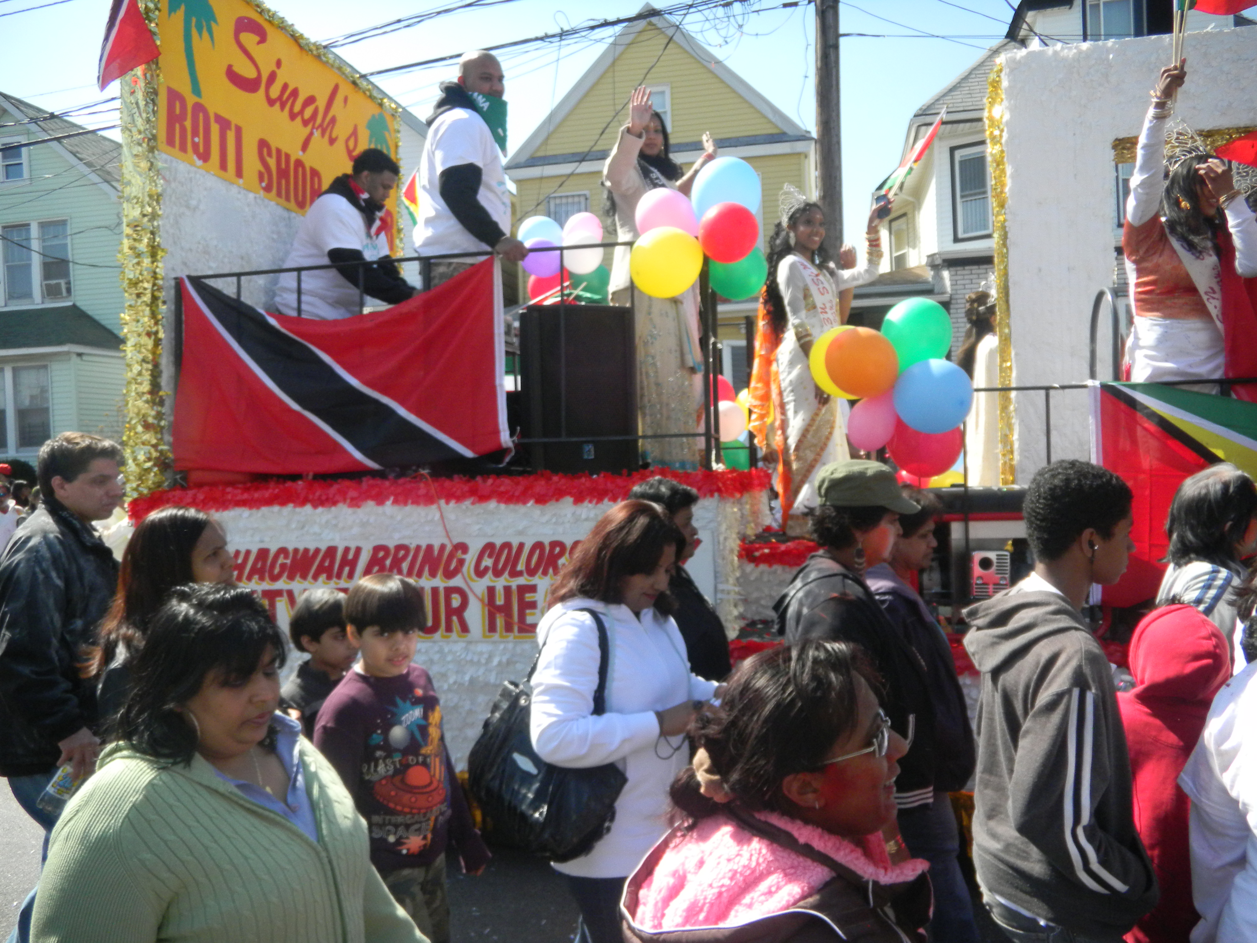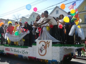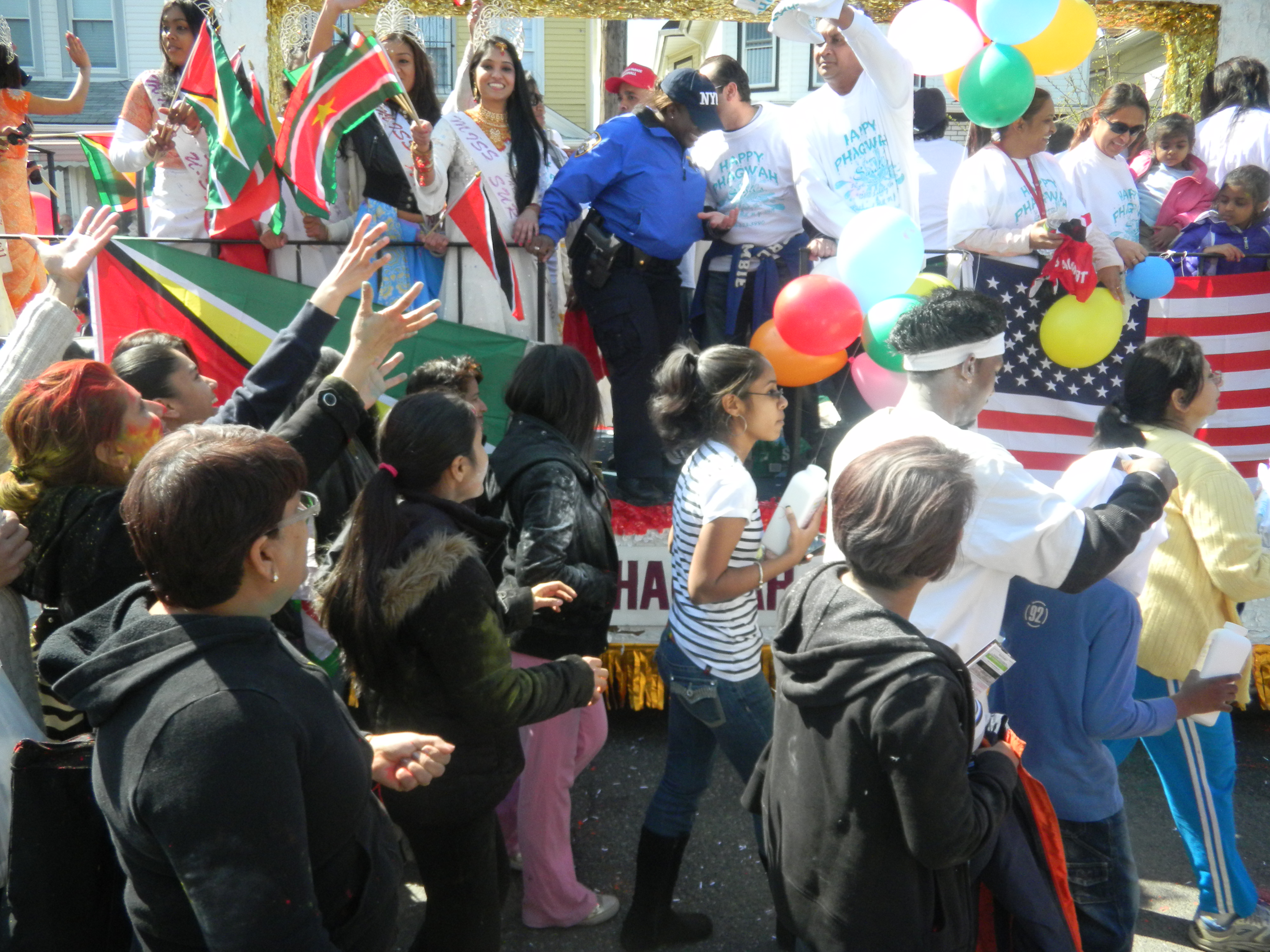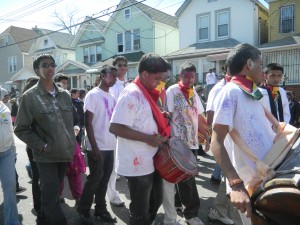 Thousands also lined Liberty Avenue. Hundreds of people of various nationalities, from their verandahs and in front of their businesses cheered the participatants as the parade marched a mile from 133rd Street on Liberty Ave to 124th Street and 95th Ave, culminating at the Smokey Park. The parade was put together by the Hindu Parades and Festival Committee headed by Spiritual Advisors Dharamcharyas Ramlall and Rishi Misir. The celebration has become popular since it was started in 1990, with people joining in the joy of throwing abeer and various colours of powder to mark this festival. They smeared each other’s faces with coloured powder. People hugged each other wishing “Happy Holi” as a dozen floats made their way with groups singing and dancing behind to the accompaniment of dholak drums, tassa, and loud chowtaal music. Revellers waved the flags of their home country.