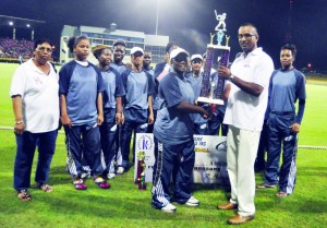 Mike’s Wellwoman skipper, Abena Parker, receives the championship trophy and $500,000 prize from president of the GSL, Hakim Khan, in the presence of her teammates