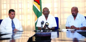 Local Government Minister Ganga Persaud is flanked by Junior Minister Norman Whittaker and Permanent Secretary Collin Croal (left)