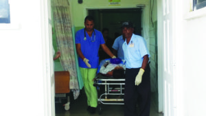 According to the sister of the injured woman, Synetha Hoyte, her sister’s reputed husband was trying to slit her throat when another man intervened, lashing him with a chair.