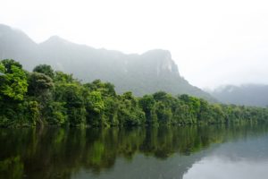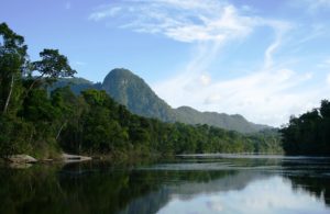 The crystal clear waters of the Potaro river reflects the forested mountain ranges