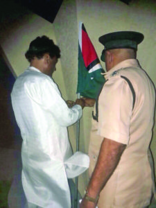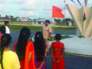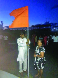 To symbolise its duty to our nation and Dharma, the HSS’ Bhagwa Dhwaj (flag) and National Flag of Guyana were hoisted and both tied with Rakhis by the Sanghachalak, Asst. Supt Singh and Ms. Sandy Basdeo of the New India Assurance Co. This was followed by tying of Rakhis on all present, while ShrimatiLoveena Ji of the Nirvana Humanitarian Foundation sung Raksha Badhan Bhajans.