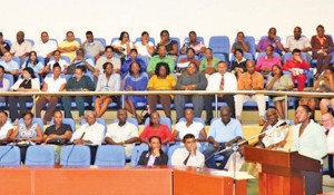 Human Services and Social Security Minister Jenifer Webster speaking at the Labour, Human Services, and Social Security Ministry staff conference at the Guyana International Conference Centre in Georgetown