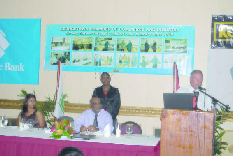 REDjet CEO Ian Burns (right) addresses the business community; GCCI’s President Komal Ramnauth (centre) and other GCCI officials are at the head table