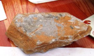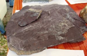 Slate is a fine grained, foliated, homogenous metamorphic rock derived from an original shale-type sedimentary rock composed of clay or volcanic ash. Shale is a fine-grained, clastic sedimentary rock composed of mud that is a mix of flakes of clay minerals and tiny fragments of other minerals. (Information by Guyana Geology and Mines Commission)