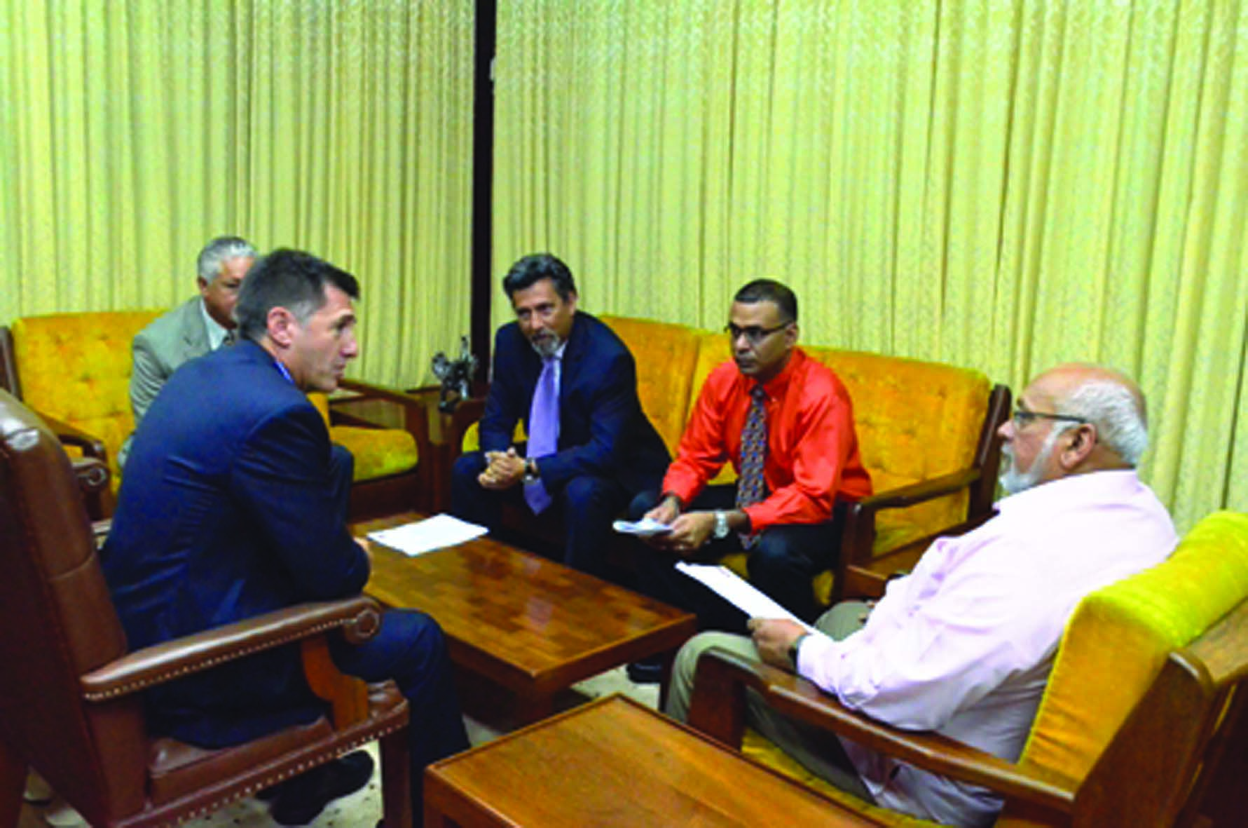 President Donald Ramotar and Natural Resources Minister Robert Persaud in discussion with Repsol officials at an Office of the President briefing on Tuesday (GINA photo)