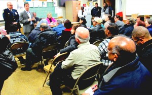 Capt. Thomas Pascale, standing left, and Assemblyman Phil Goldfeder speak with residents at the 106th Precinct Community Council meeting.