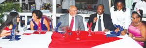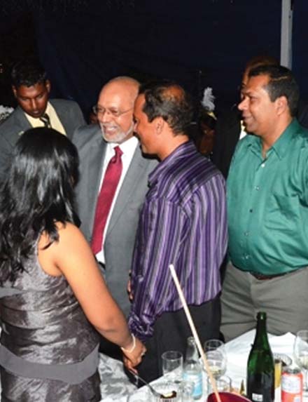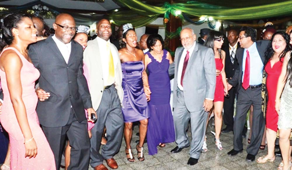President Donald Ramotar and First Lady Deolatchmie Ramotar join Army Chief-of-Staff, Commodore Gary Best and other army officials along with Attorney General Anil Nandlall at the Guyana Defence Force Old Year’s Night ball on Saturday President Ramotar and acting Police Commissioner Leroy Brummel at the head table at the Police Officers’ Mess Old Year’s Night party on Saturday. Also in photo are First Lady Deolatchmie and officials of the police force President Ramotar greets revellers at the Georgetown Club for the traditional Old Year’s Night party