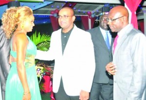 President Jagdeo, accompanied by Commodore Gary Best and Police Commissioner Henry Greene interacts with a guest at the Police Old Year’s Night ball