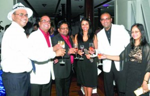 President Jagdeo and his ministers, Robert Persaud, Dr Ashni Singh and Manniram Prashad, along with Mrs Singh, and Ms Fazella ring in the New Year with a toast at the State House’s Old Year’s Night Ball