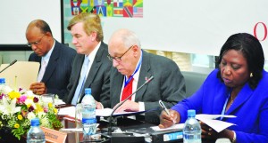Home Affairs Minister Clement Rohee (left), U.S. Ambassador Dr D Brent Hardt, Caricom Ambassador-at-Large Juan Guiliani Cury and St Kitts and Nevis National Security Ministry Permanent Secretary Astona Browne at the opening of the second meeting of the CBSI Commission on October 13 at the Guyana International Conference Centre