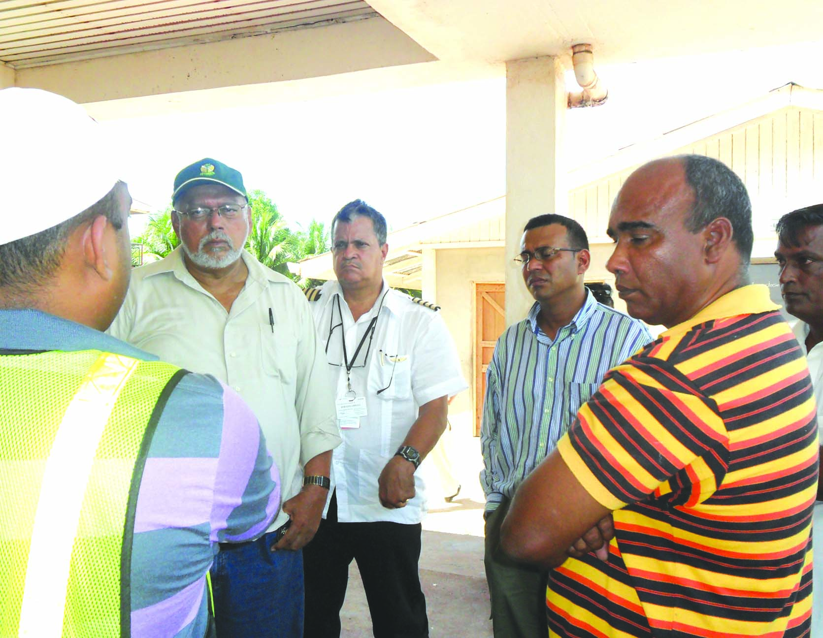 PPP presidential candidate Donald Ramotar and Agriculture Minister Robert Persaud in discussions with officials of Lethem. Also in photo is Gerry Gouveia of Roraima Group of Companies