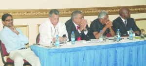 GECOM Chairman Dr Steve Surujbally is flanked by top officials at the Private Sector Commission’s Annual General Meeting on Thursday