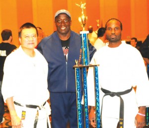 Troy Bobb (right) poses with Billy Blanks (centre) and NAFMA Director, Master Jose Rorres II, for a photo with his trophy