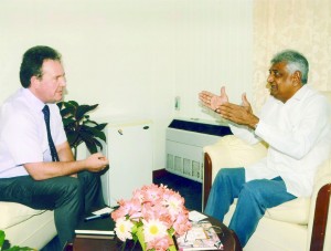 GECOM head Dr Steve Surujbally in discussion with British High Commissioner Andrew Ayre